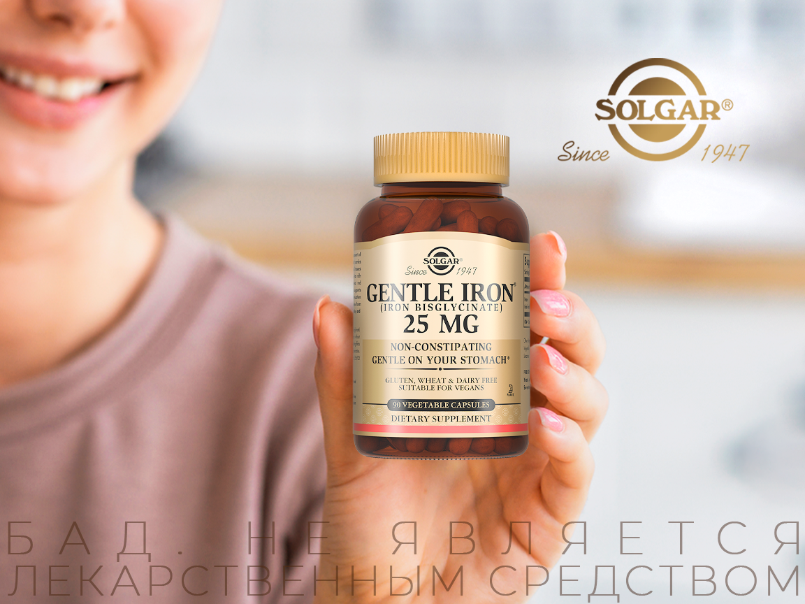 SOLGAR производит легкодоступное железо в виде хелатного соединения — бисглицинат железа. Что позволяет обеспечить более высокую усвояемость железа, и, что немаловажно, минимум побочных эффектов со стороны желудочно-кишечного тракта. Также продукт подойдет вегетарианцам, так как капсула растительного происхождения.